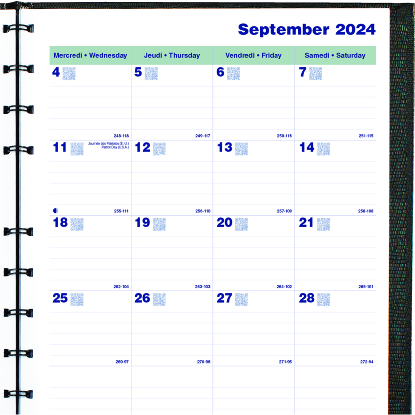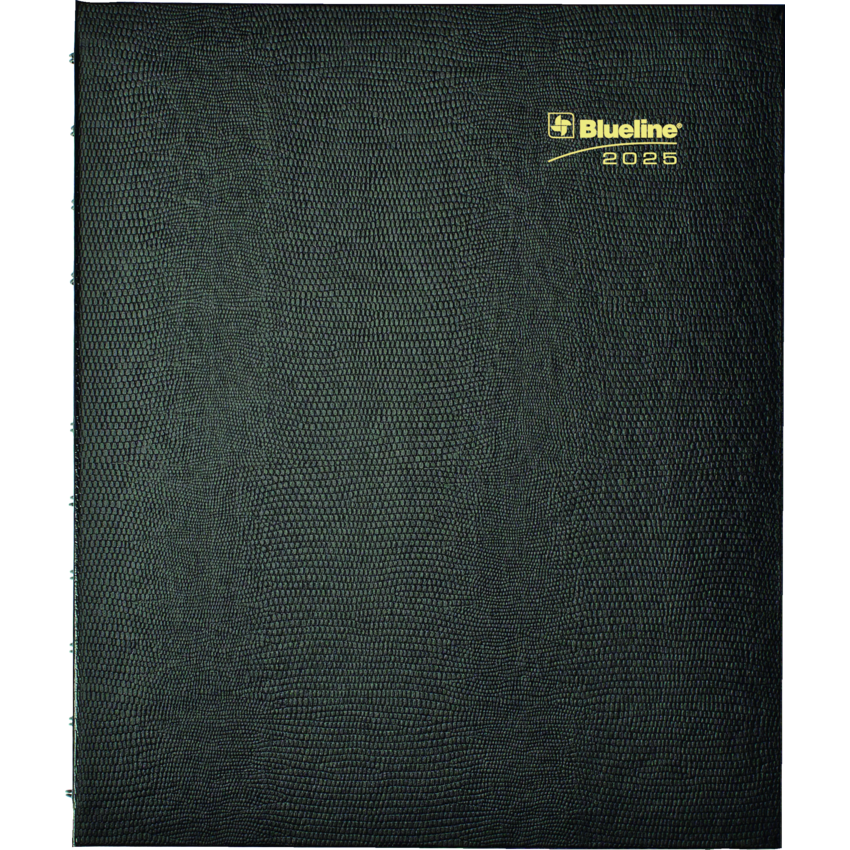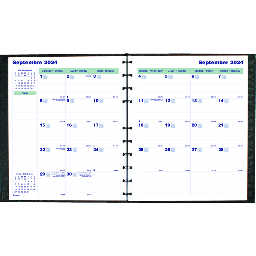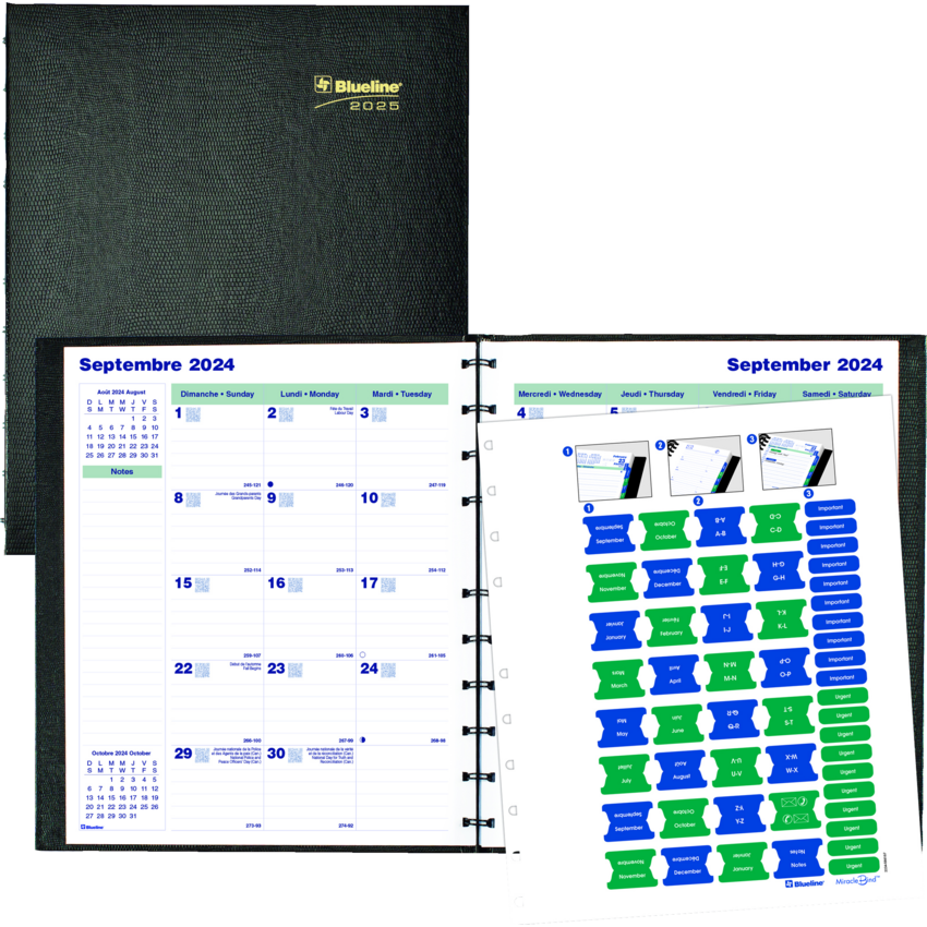 Contains a minimum of 50% post-consumer recycled material. FSC® Certified. Twin wire bound. Hard, lizard-like cover. 1 month per 2-page spread. 16 months, September to December. 30 MiracleBind™ ruled pages that can be removed and reinserted. Self-adhesive, laminated tabs and storage pocket. 11" x 9-1/16". Bilingual. Black.