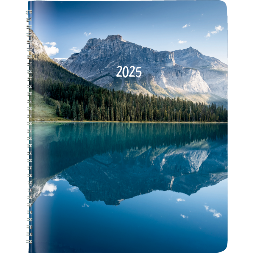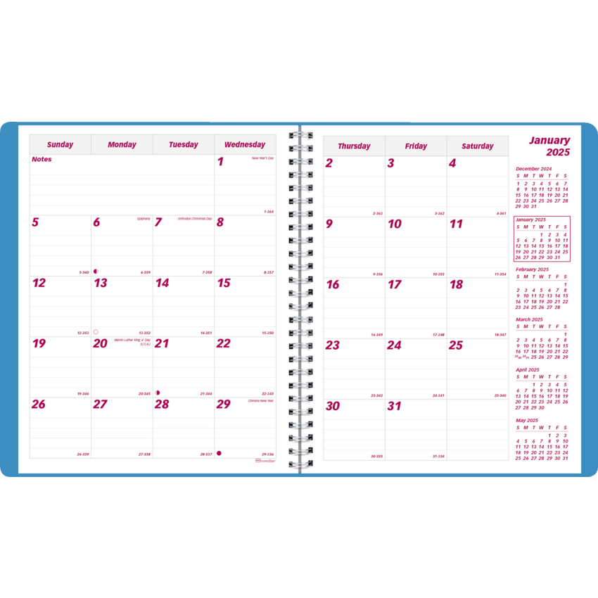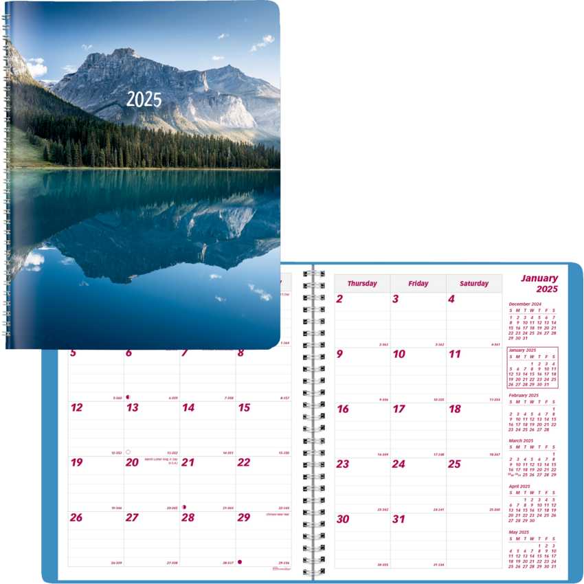 Contains a minimum of 50% post-consumer recycled material. FSC® Certified. Twin wire bound. Soft printed cover. 1 month per spread, 1 ruled block per day. 14 months, December to January. Past, current, and following 4 reference months on each spread. 8-7/8" x 7-1/8". English. Blue.