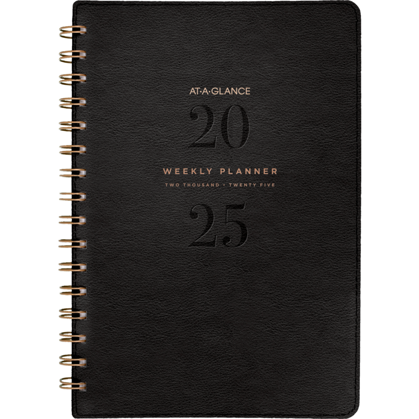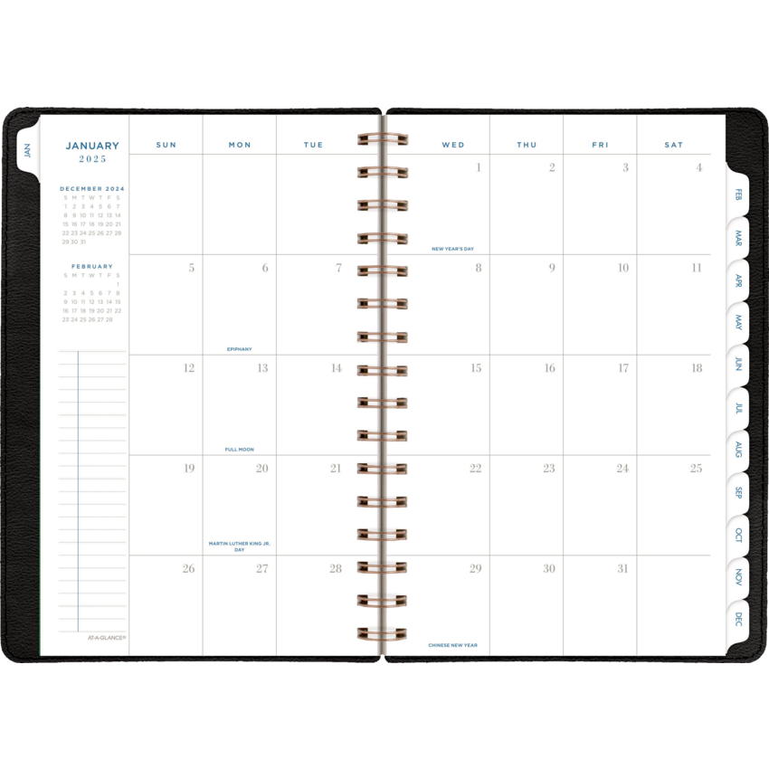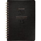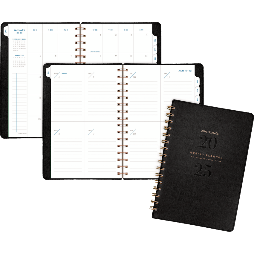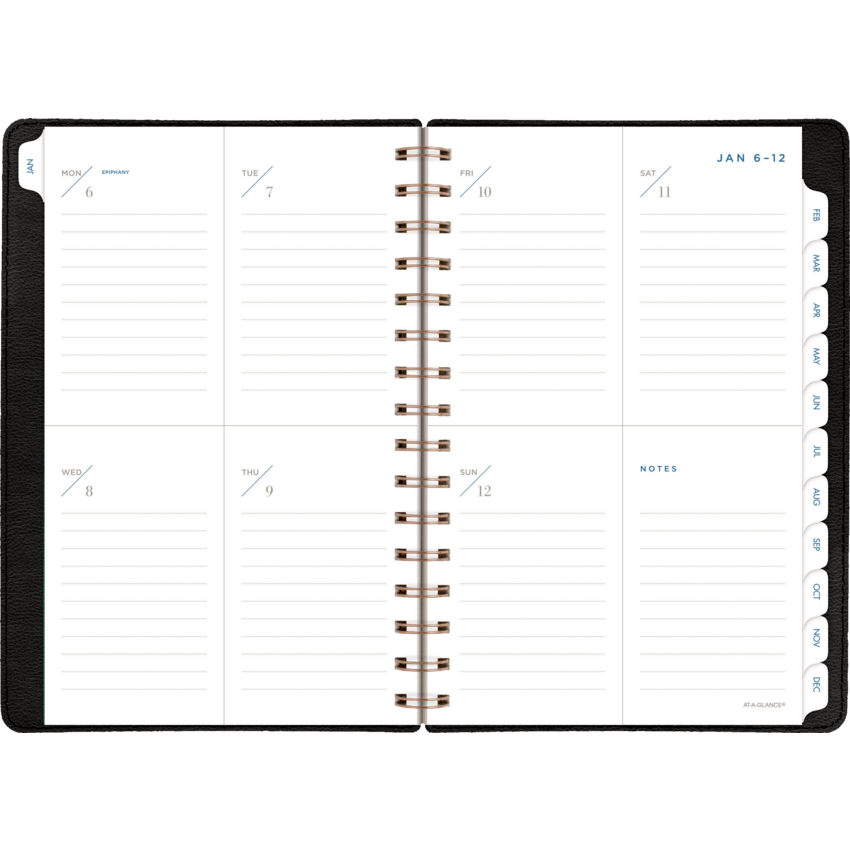 Twin coil wire bound. Bonded leather cover. 13 months January - January. 2 page per week, 2 page per month. Features past and future months reference. 3 year reference calendar, double sided storage pocket, telephone/address page, pages for notes, event calendar and holidays. 8-3/4" x 6". English. Black.
