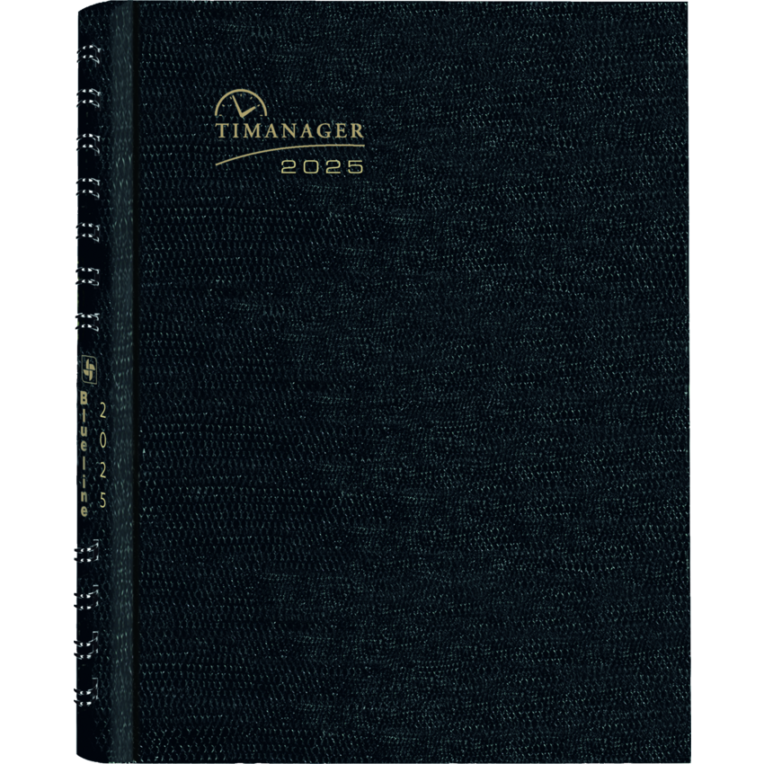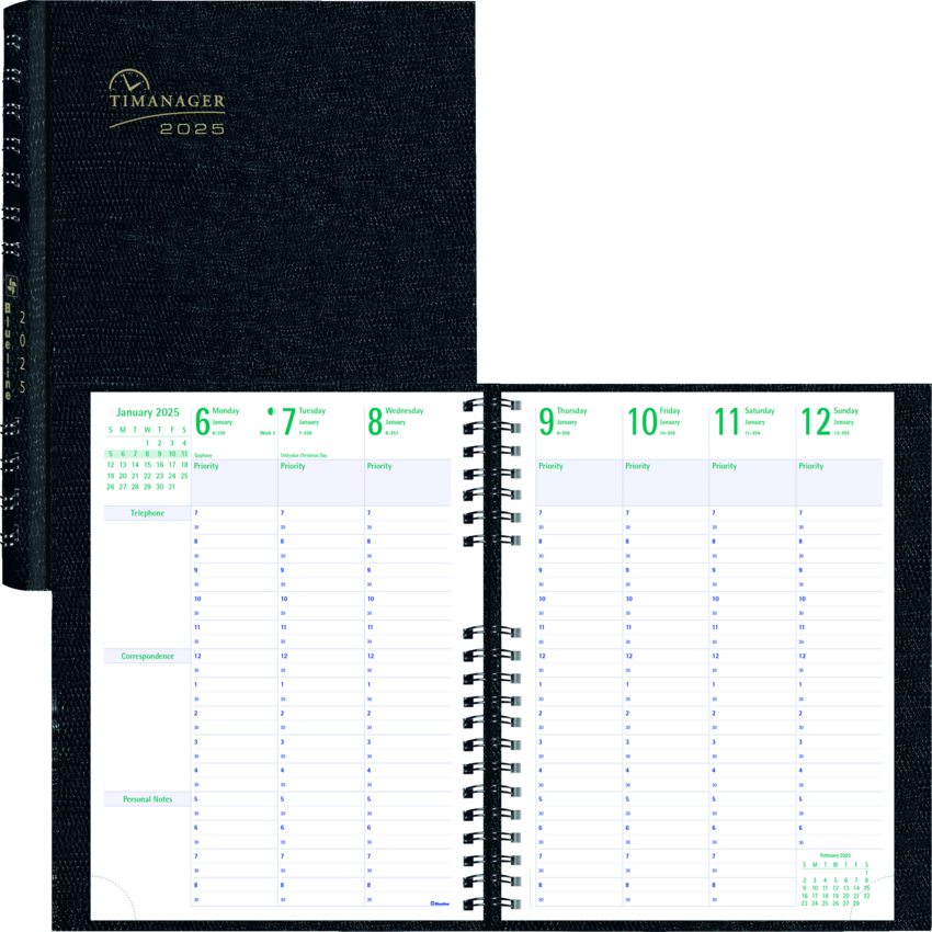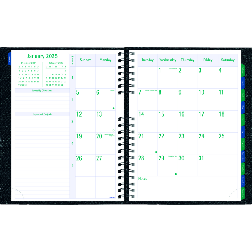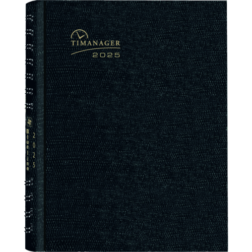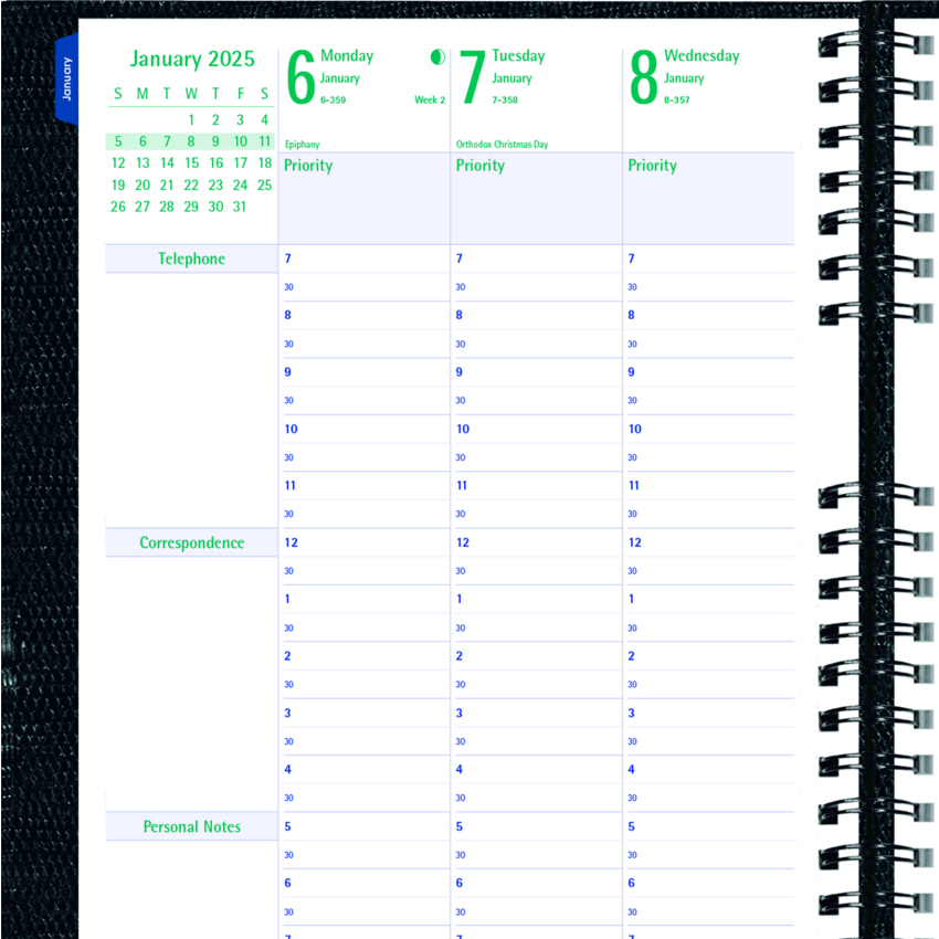 Each spread has boxes for daily priorities, phone calls, correspondence and personal notes. Includes monthly self-adhesive tabs and a practical double-sided pocket Contains a minimum of 50% post-consumer recycled material. FSC® Certified. Twin wire bound. Hard, lizard-like cover. 1 week per 2-page spread. 13 months, December to December. 7:00 a.m. to 8:30 p.m. in 1/2 hour intervals. Monthly planner at beginning of each month. 11" x 8-1/2". English. Black.