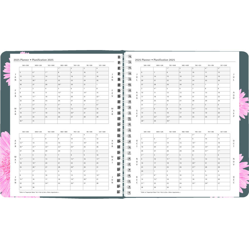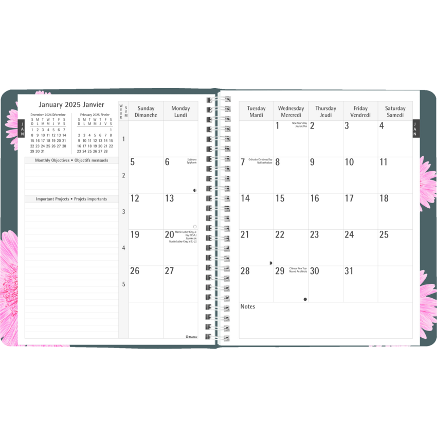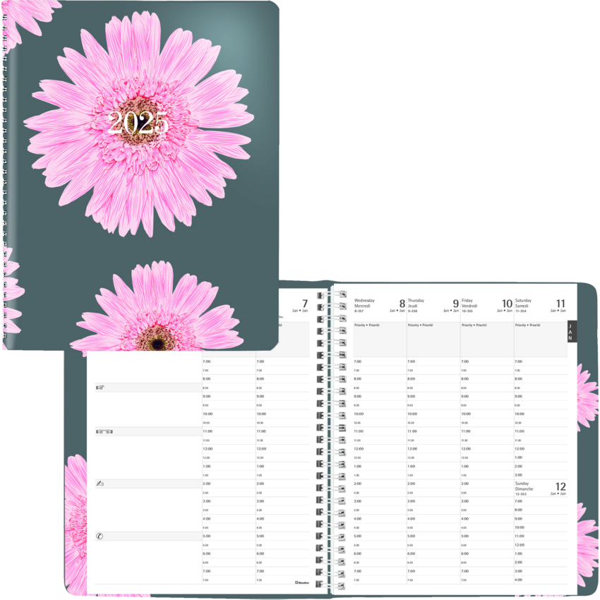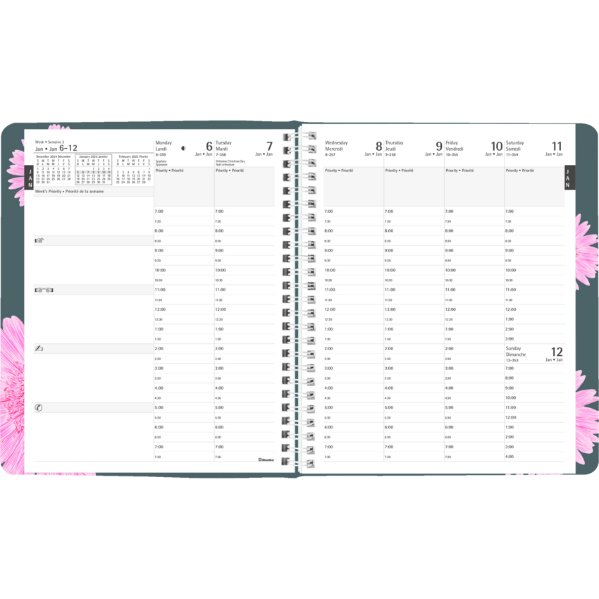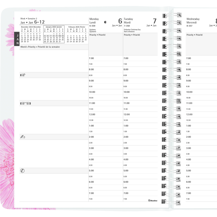 Blueline has proudly contributed over a million dollars to the breast cancer cause since 2007 from the sale of the Pink Ribbon products. Your purchase will help us surpass our goal of $25,000 this year. Contains 50% post-consumer recycled material. FSC® Certified. Twin wire bound. Soft cover. 1 week per 2-page spread, 13-month planner, December to December. 7:00 a.m. to 7:30 p.m. in 1/2 hour intervals. 7-day spread with a monthly planner at the beginning of each month Each spread has boxes for daily priorities. 8-1/2" x 6-3/4". Bilingual. Pink.