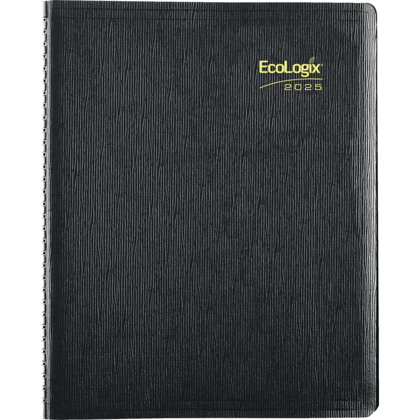 100% post-consumer recycled paper. FSC® Certified. Twin wire bound. Soft, Romanel cover. 1 week per 2-page spread. Weekdays 7:00 a.m. to 8:45 p.m. and Saturdays from 7:00 a.m. to 5:45 p.m in 15-minute intervals Ruled spaces for Sunday. Telephone and address section. Ecological tips. 11" x 8-1/2". English. Black.