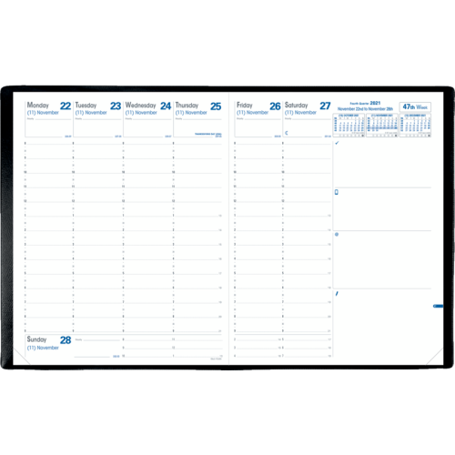 Sewn bound. 1 week per 2-page spread. 8:00 a.m. to 9:00 p.m. in 1/2 hour intervals. 9-1/2" x 6-1/4". English.