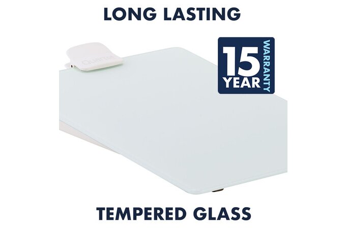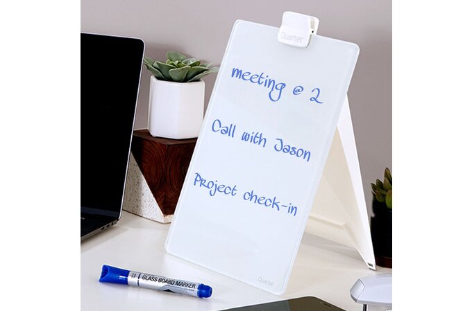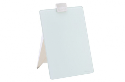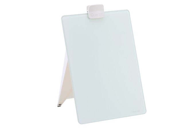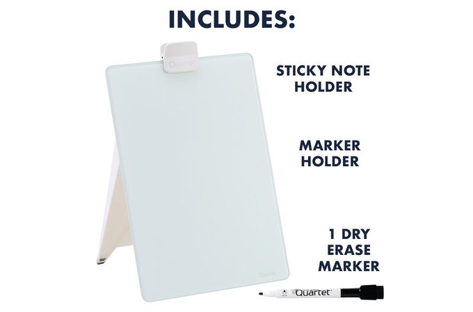 White glass desktop easel is infinitely reusable and replaces the need for scrap paper. Clipboard-style design allows dry-erase desktop easel to double as a copy holder for letter or A4 size papers. Back of easel has a built-in storage slot to hold standard size sticky notes. Includes one Quartet dry-erase marker. 9" x 11". 15 year warranty.