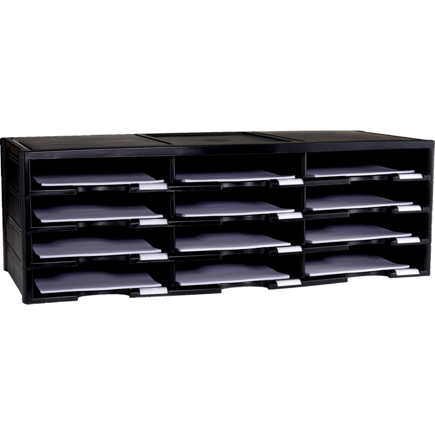 Heavy-duty, plastic construction is more durable than cardboard and more cost-efficient than metal or wood. Plastic construction is durable and attractive. 12-unit kits are stackable to fit up to 72 compartments. 100% post-consumer recycled material. Removable clear tab covers allow the labelling of each compartment. 12 compartments per unit (9-1/2"W x 12-1/4"D x 2"H). Stacks up to 6 units high. 31-3/8”W x 14-1/8”D x 10-1/2”H. Black.