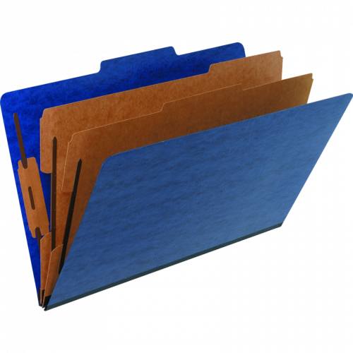 Fasteners on front and back panels and the 2 kraft dividers create 6 separate filing surfaces. Durable 25 pt. pressboard cover with colour-matched reinforced tape gusset Contains a minimum of 30% post-consumer recycled material. Legal size. 17 pt dividers. Blue.