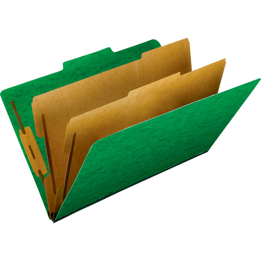 Fasteners on front and back panels and the 2 kraft dividers create 6 separate filing surfaces. Durable 25 pt. pressboard cover with colour-matched reinforced tape gusset Contains a minimum of 30% post-consumer recycled material. Legal size. 17 pt dividers. Green.