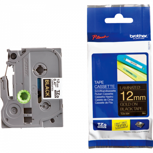 For P-Touch® GL100*, 200, 300, 310, 320, 330, 520, 530, 1000*, 1090*, 1180*, 1200*, 1230PC*, 1250*, 1290*, 1500PC*, 1700AD, 1750, 1800, 1830, 1880, 1900, 1950, 2030, 2100, 2200, 2300, 2430PC, 2500PC, 2600, 2700, 2730. *Not compatible with 18 mm (3/4") or. 12 mm (1/2”). Gold on Black.