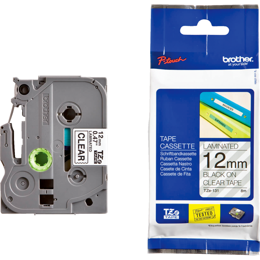 For P-Touch® GL100*, 200, 300, 310, 320, 330, 520, 530, 1000*, 1090*, 1180*, 1200*, 1230PC*, 1250*, 1290*, 1500PC*, 1700AD, 1750, 1800, 1830, 1880, 1900, 1950, 2030, 2100, 2200, 2300, 2430PC, 2500PC, 2600, 2700, 2730. *Not compatible with 18 mm (3/4") or. 12 mm (1/2”). Black on Clear.