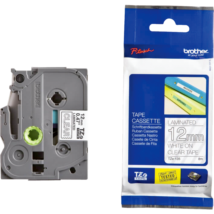 For P-Touch® GL100*, 200, 300, 310, 320, 330, 520, 530, 1000*, 1090*, 1180*, 1200*, 1230PC*, 1250*, 1290*, 1500PC*, 1700AD, 1750, 1800, 1830, 1880, 1900, 1950, 2030, 2100, 2200, 2300, 2430PC, 2500PC, 2600, 2700, 2730. *Not compatible with 18 mm (3/4") or. 12 mm (1/2”). White on Clear.
