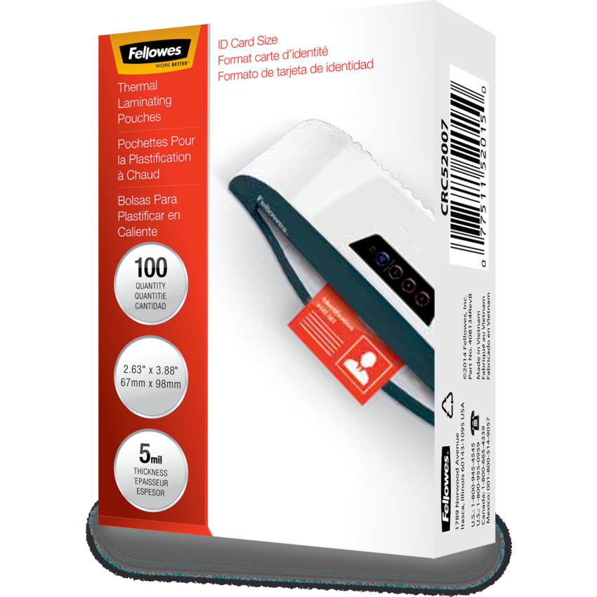 Designed with quality photo safe materials providing excellent clarity and durability to preserve and protect important documents. Dry-erase friendly and compatible with all thermal laminator brands. Government/ID Tag. 5 mil. 2-5/8" x 3-7/8". 100/pkg.