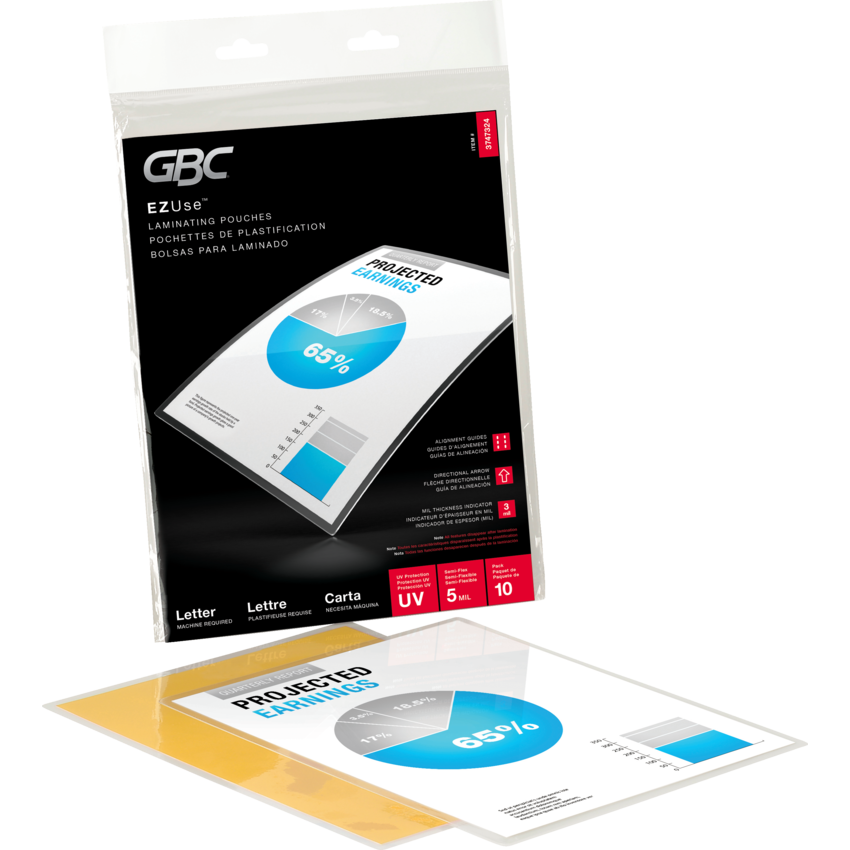 Take away the pain points associated with traditional pouch lamination. Visible EZUse™ feature disappears after lamination. UV protection prevents fading and discolouration over time. Alignment guides make centering easy. Icons clearly identify pouch thickness. Directional arrows indicate which edge of pouch should be loaded first. Letter size. 5 mil. 10/pkg.