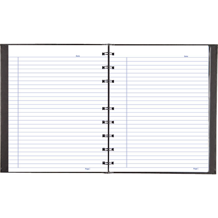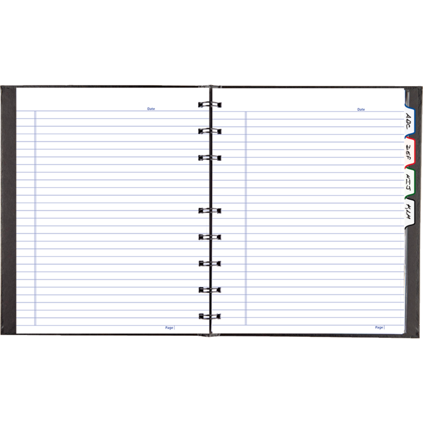 Contains a minimum of 50% post-consumer recycled material. FSC® Certified. Hard cover. Twin wire bound. Includes colour-coded, self-adhesive tabs, storage pocket and index front sheet. Micro-perforated ruled pages. 192 pages. Refillable with MiracleBind™ sheets. 9-1/4" x 7-1/4". Black. Also available in a package of 5.
