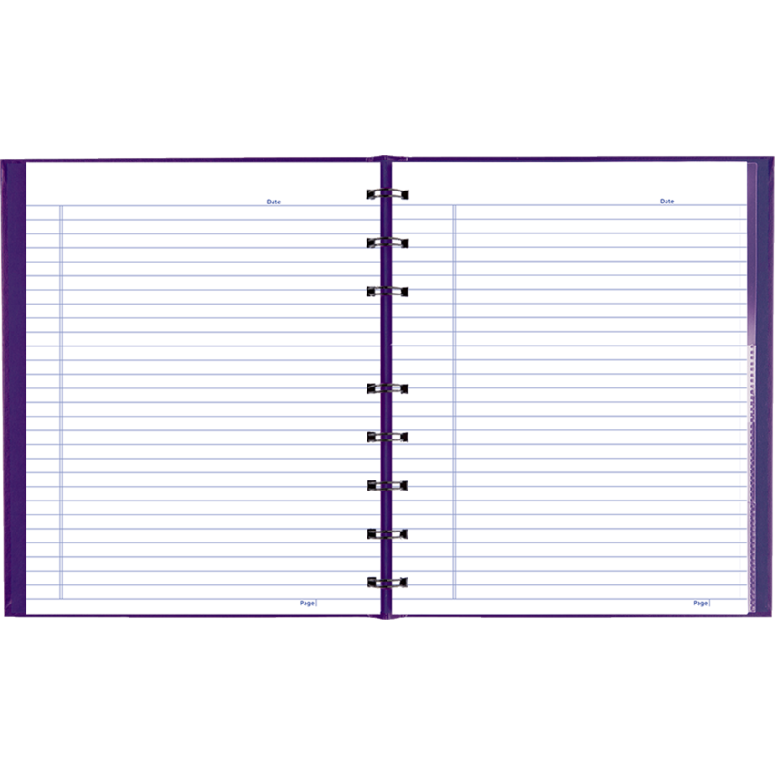 Contains a minimum of 50% post-consumer recycled material. FSC® Certified. Hard cover. Twin wire bound. Includes colour-coded, self-adhesive tabs, storage pocket and index front sheet. Micro-perforated ruled pages. 192 pages. Refillable with MiracleBind™ sheets. 9-1/4" x 7-1/4". Purple. Also available in a package of 5.