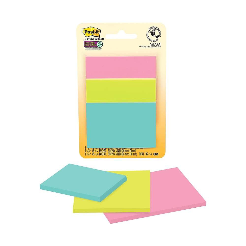 Post-it Super Sticky Notes hold stronger and longer than most self-adhesive notes so you can be sure that your message gets through. Unique adhesive gives you the confidence to leave short reminders and notes on multiple surfaces including computer monitors, office doors and walls. Notes stick to almost any surface and don't fall off. They remove cleanly. The paper in Post-it Notes is sourced from certified, renewable and responsibly managed forests. Notes are recyclable.