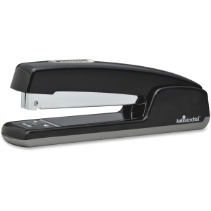 Sleek and polished finish with durable, die-cast metal design. Refill window avoids empty-stapler surprises. Dual clinch for permanent or temporary stapling. Refill window avoids empty-stapler surprises. Dual clinch for permanent or temporary stapling Anti-microbial protection. Refill window avoids empty-stapler surprises. Full strip. 20 sheets. Opens for tacking. Standard staples. Black.