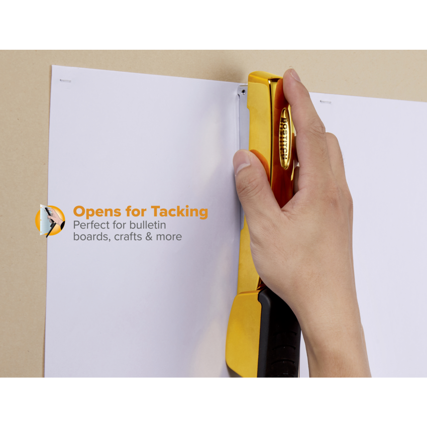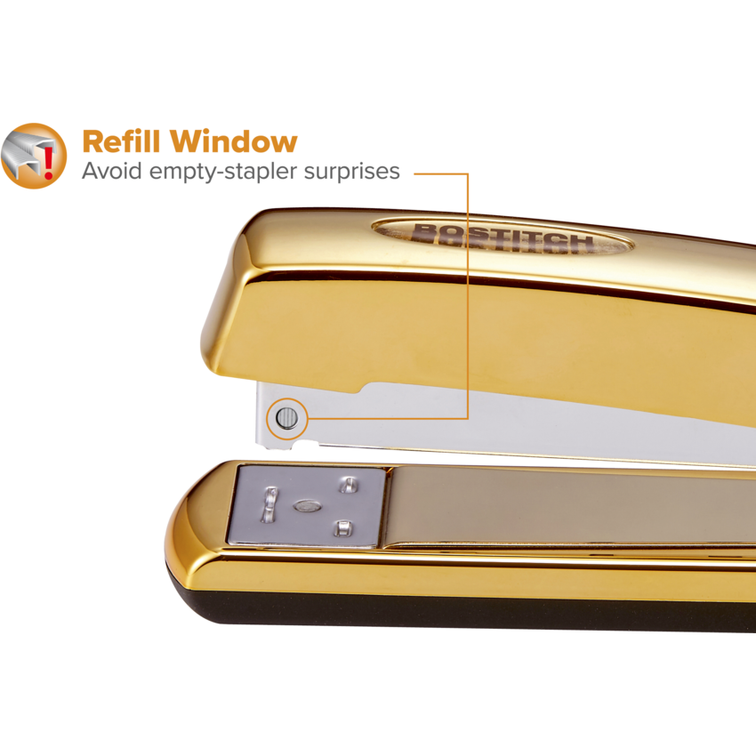 Sleek and polished finish with durable, die-cast metal design. Refill window avoids empty-stapler surprises. Dual clinch for permanent or temporary stapling. Refill window avoids empty-stapler surprises. Dual clinch for permanent or temporary stapling Full strip. 20 sheets. Opens for tacking. Standard staples. Gold.