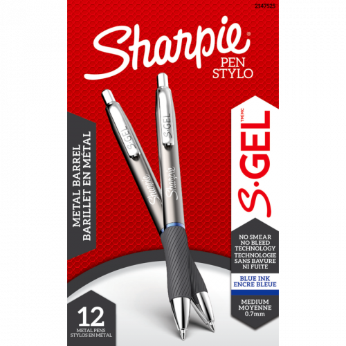 The power of Sharpie is now in a metal gel pen. This S-Gel is a high-performance gel pen with a sleek, metal barrel and professional look that’s sure to stand out. With no-smear, no-bleed technology and bold, unrivalled ink, this Sharpie pen delivers always-vivid writing 0.7 mm. Gunmetal barrel. Blue ink. 12/box.