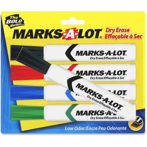 Easily get your thoughts across and share bright ideas with a splash of colour. The Marks-A-Lot® Dry Erase Marker set features four colours with broad chisel tips to let you write in a variety of thin or bold line widths without having to change pens. Bright, colourful ink will catch your viewers' eyes and will easy wipe away from whiteboards, mirrors and other nonporous surfaces with the sweep of an eraser or dry cloth. Wield the dry-erase markers confidently while the multi-faceted cap sits securely in the bottom. The non-toxic, low-odour, certified formula makes the dry-erase markers safe for use at work, at home, or at school so you can communicate loud and clear, anywhere.