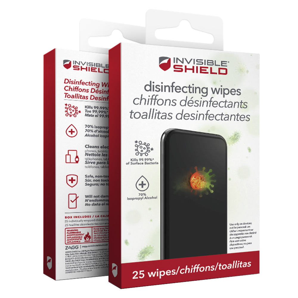 Keep device surfaces 99.99% germ free. InvisibleShield Disinfecting Wipes have been 3rd party tested against germs such as E. Coli and Staph. These individually wrapped wipes are made for use on electronic surfaces, so they will not damage surface treatments like oil-resistant coatings, and meet the device manufactuerer recommended qualifications for phone cleaning solutions.