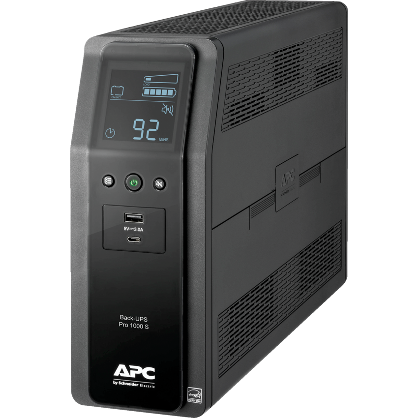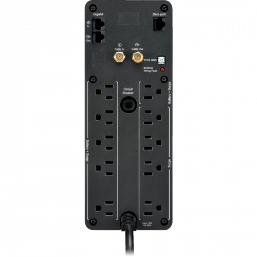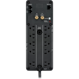Provides protection of connected equipment from power surges on the data lines and reduces line noise that can cause data loss and keyboard errors. LCD interface has text and mimic diagrams that display modes of operation, system parameters and alarms. 10 Outlets and 2 USB Charging Ports. Includes coaxial cable, USB cable and user manual. 1000 VA/600 W. Backup time at 180W load: 23.1 minutes. Standard 3-year warranty.