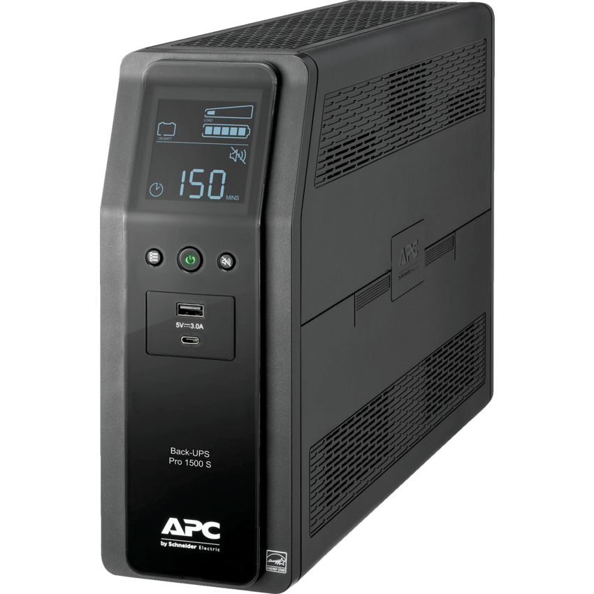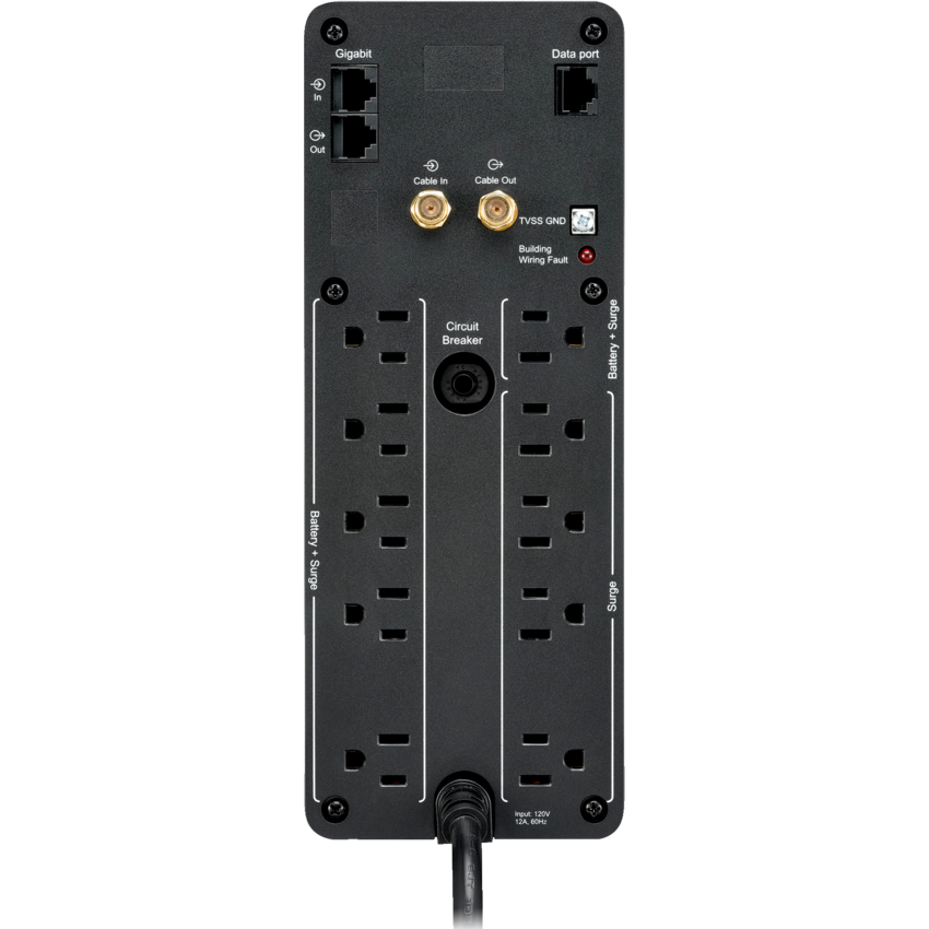 Provides protection of connected equipment from power surges on the data lines and reduces line noise that can cause data loss and keyboard errors. LCD interface has text and mimic diagrams that display modes of operation, system parameters and alarms. 10 Outlets and 2 USB Charging Ports. Includes coaxial cable, USB cable and user manual. 1500 VA/900 W. Backup time at 180W load : 44.3 minutes. Standard 3-year warranty.